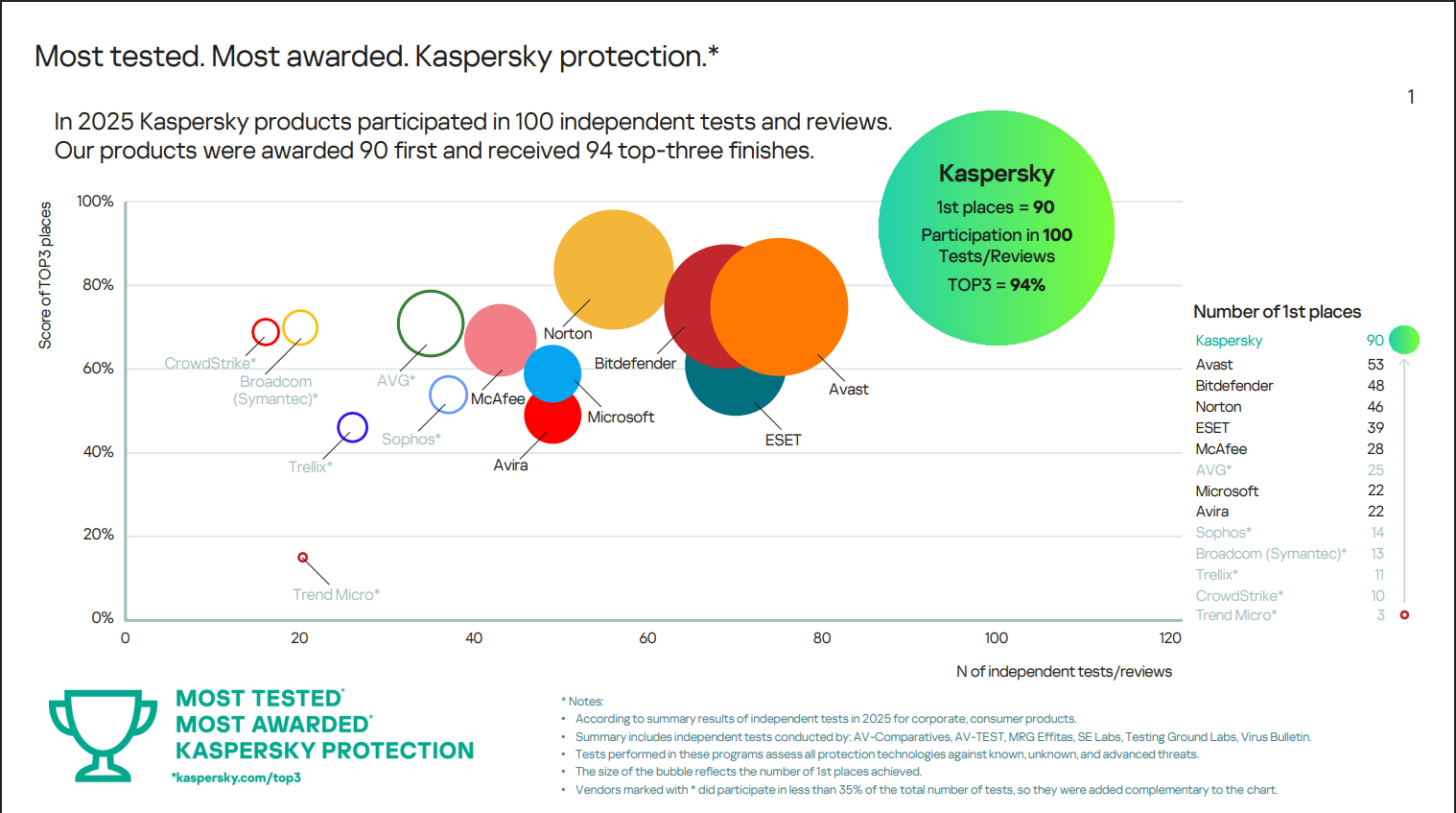 Die Testergebnisse 2025 zeigen Kasperskys Leistung in allen relevanten Kategorien der IT Security. Die unabhängigen Prüfungen umfassten Advanced Threat Protection (APT), Ransomware-Abwehr, Phishing-Schutz, Exploit-Erkennung und Fileless Attacks. Bemerkenswert dabei: Kaspersky nahm an allen 100 durchgeführten Tests teil – mehr als jeder andere Anbieter. Während andere Hersteller selektiv an Tests teilnehmen, stellt sich Kaspersky konsequent dem Vergleich. In 90 Fällen erreichte Kaspersky Platz 1, in 94 Prozent aller Tests lag die Lösung unter den Top 3. Zum Vergleich: Der nächstplatzierte Anbieter Avast erreichte 53 erste Plätze bei 75 Tests, Bitdefender 48 bei 69 Tests. Die Ergebnisse stammen von anerkannten Testinstituten wie AV-Comparatives, AV-TEST, MRG Effitas, SE Labs, Testing Ground Labs und Virus Bulletin.